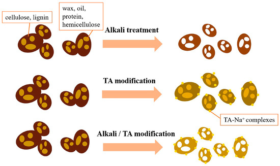 Improvements in the tensile properties could be attributed to the improved dispersion of CGs and the enhanced physical adhesion between CG and PBAT because the crystallinity of these samples was similar [46]. The improved interfacial adhesion provides a better stress transfer from PBAT to CG, which results in a more compact fracture and better tensile properties. The mechanisms of alkali treatment, TA modification, and alkali/TA synergistic modification of CG are shown in Figure 7.