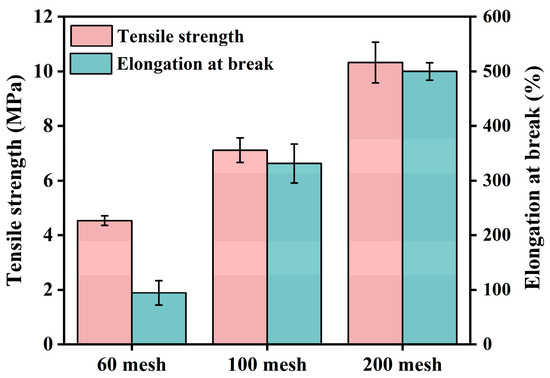 Compared to neat PBAT, the PBAT/CG composites showed decreased tensile properties even with modified CG, which was maybe closely related to micro-sized CGs. Therefore, the effect of the CG particle size on the tensile properties of the PBAT/CG composites was also investigated. As shown in Figure 8, the CG particle size was reduced by a mechanical crusher, sieved, and finally, it acquired three types of CGs with average particle sizes of 48.23, 28.19, and 21.25 μm under different mesh sieves of 60, 100, and 200 mesh.