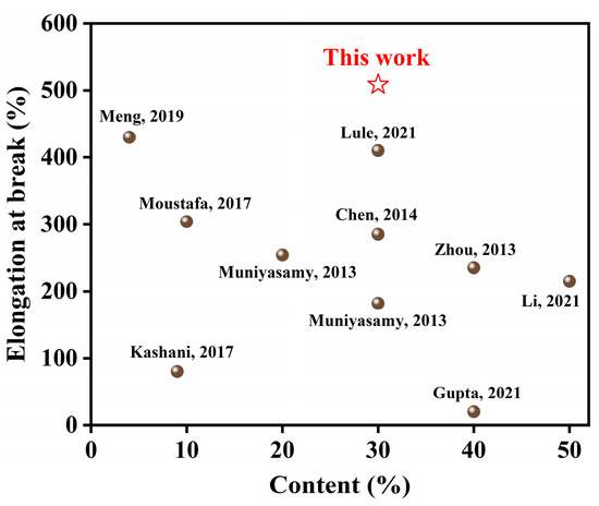 Figure 10 compares the filler content and elongation at the break of the prepared PBAT/CG-OH-TA composites in this study with other PBAT-based composites [2,26,46,51,52,53,54,55,56]. In most of those studies, the loading of the incorporated biomass affected the mechanical properties, especially at high filler contents. The tensile properties of the composites could be improved by filler modification, but the used method often affects the elongation at break. However, in our study, compared to PBAT/CG composites, the obtained PBAT/CG-OH-TA composites here improved the tensile strength as well as the elongation at break. This was probably due to the increase in surface roughness of CG modified by TA, which facilitated CG distribution and the mechanical interlocking between CG and PBAT. In conclusion, the modification method used in this study preserved the excellent toughness of PBAT and provided a valuable reference for biomass-based fillers for the preparation of composites.