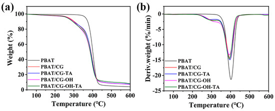 (a) TGA curves and (b) DTG curves of PBAT and PBAT/CG composites.