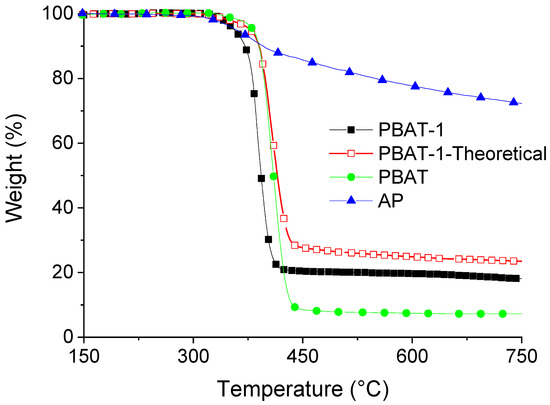 TGA curves (N2, 10 °C/min) of pure PBAT, AP, and PBAT-1 composition (experimental and theoretical).