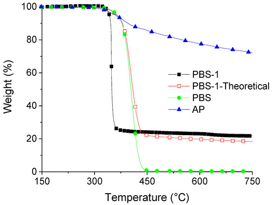 TGA curves (N2, 10 °C/min) of pure PBS, AP, and PBS-1 composition (experimental and theoretical).