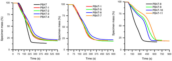 Mass of specimen as a function of time for PBAT compositions.
