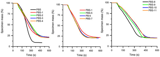 Cone calorimeter curves of PBS are presented in Figure 7 and Figure 8 and complementary results are supplied in Table 9. The HRR curve of virgin PBS is less sharp than PBAT. In addition, for all the flame-retardant compositions, the pHRR appears very early, around 100 s, which is similar to all the corresponding compositions of PBAT. This could be ascribed to the influence of APP on the biobased macromolecules. As seen in TGA thermograms, APP strongly impairs the thermal stability of PBS before promoting a charred structure. The use of MPP and SuperPozz cannot offset this effect. Nevertheless, once again, compositions with 12.5 wt% APP, 6.25 wt% MPP, and 6.25 wt% of surface-treated SuperPozz impart a synergistic effect on the fire reaction parameters and delay the mass loss (Figure 8). It can also be remarked that titanate coupling is more beneficial, albeit the performance is less outstanding in comparison with PBAT. The benefits of employing coupling agents can be viewed through the decrease in the MAHRE, allowing the HRR peaks to be shifted to higher time values. Their action could be explained by a better dispersion of the fly ash leading to a better interaction with flame retardants, as well as a superior coupling with the polymers and a concomitant improvement of the cohesion of the residue. UL94 results show that the addition of APP leads to V-2 classification. The partial replacement of APP by FA does not lead to an improvement in the observed behavior. Interestingly, the addition of MP leads to a V-0 classification, probably due to an improved char formation which is able to limit the flame propagation.