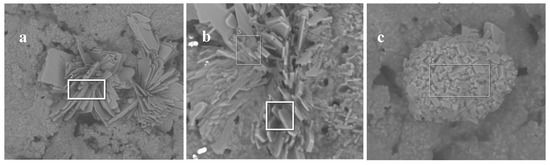In some cases, spheroidal structures made of platelets can be identified as well as initial fly ash particles, with some of them exhibiting the early stages of transformation into new structures (Figure 11). On the whole, there are no significant differences between residues from PBS or PBAT compositions, either as a result of the presence of MPP or the surface treatments of the fly ash.