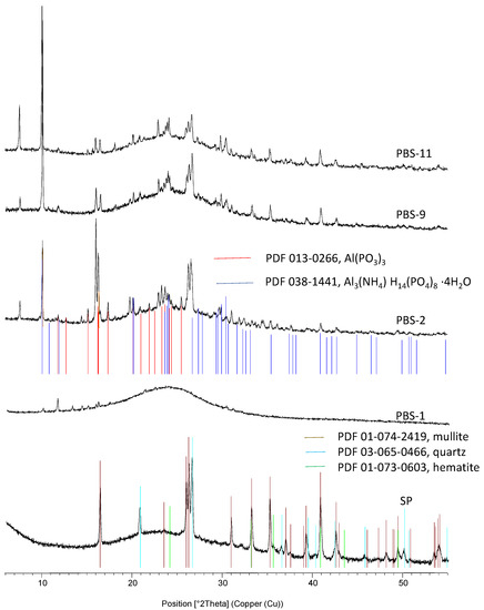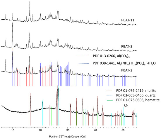 Complementary investigations are needed to fully understand the mode of action involved as well as the structure of the protective layers. All the residues have been analyzed using XRD. Figure 13 and Figure 14 present the corresponding diffractograms for the raw fly ash and the following compositions of residues, respectively, for PBAT and PBS. A hump appears on the diffractograms of compositions without fly ash (presented here only for PBS-1), indicating the formation of X-ray amorphous structures. For the patterns corresponding to samples containing SP in their formulation, one notes, in addition to the amorphous hump, the presence of crystalline phases present in the raw fly ash and the formation of two components resulting from reactions between fly ash and flame retardants: an aluminum phosphite Al(PO3)3 and a hydrated ammonium phosphate (Al3(NH4)H14(PO4)8.4H2O). They are not dependent on the composition of the FR system. Moreover, the additional presence of hydrated iron phosphate seems likely. To our knowledge, these components were never reported in the composition of residues related to combinations between APP or APP + MPP combined with silicates in FR systems for polymers. As reported in the introduction, a study [28] combined fly ash with APP and pentaerythritol in ethylene vinyl acetate coatings for steel structures. The analysis of combustion residues by X-ray diffraction after exposure to a butane burner revealed the presence of SiP2O7 silicophosphates. In a previous article recently submitted [41], we carried out similar combinations between fly ash and the same flame retardants in polylactide. It was noted that this last polymer exhibited a lower degree of interaction with APP during its thermal decomposition in comparison with PBAT and PBS. The analysis of cone calorimeter residues also highlighted the formation of cohesive and protective layers corresponding to a strong retention of the initial phosphorus in the condensed phase, but the crystalline phases identified by X-ray diffraction were two ammonium phosphates, NH4AlP2O7 and Al(NH4)HP3O10. Therefore, the combinations performed in the present paper have led to the formation of specific compounds due to, on the one hand, the reaction of APP with the polymers and, on the other hand, the reactions of the flame retardants with fly ash.