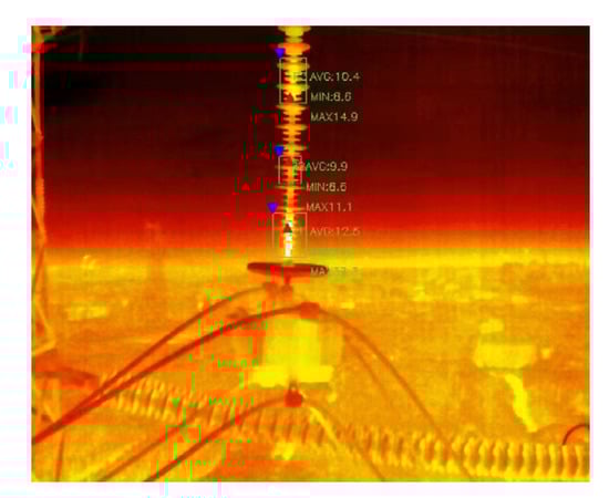 This study examined six 220 kV composite insulators with abnormal heating, including sheath-aging, decay-like, and contaminated insulators named A-1, A-2; B-1, B-2; and C-1, C-2, respectively. The sheath-aging insulators were from the same line. Due to the low probability of decay-like insulators, samples were collected from several transmission lines. The solid-coating method [21] was applied to construct the contaminated composite insulators artificially. The ratio of the equivalent salt deposit density (ESDD) to the non-soluble deposit density (NSDD) was 1:6, and the values for the ESDD were 0.08 mg/cm2 and 0.12 mg/cm2 [22]. Sodium chloride and diatomite were utilized to simulate conductive and insoluble substances, respectively. Figure 1 is the infrared thermal image of the running composite insulator.