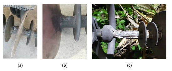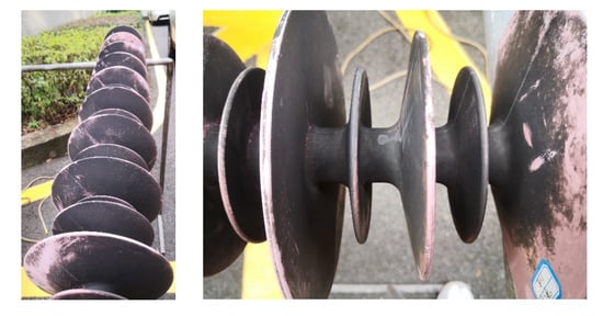 The appearance of the sheath-aging and decay-like composite insulators is shown in Figure 2 and Figure 3, respectively. There was obvious pulverization on the insulator sheds, and many cracks appeared on the pulverization layer. The severe aging of the sheds could be inferred from the depth of the cracks. The dirt and pulverization layers coexisted on the shed’s surface.