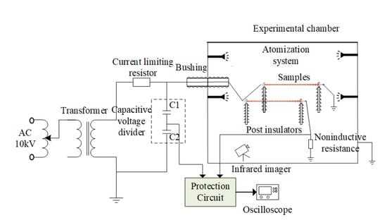 The applied voltage was measured by a capacitive voltage divider and voltmeter, and the ratio of the voltage divider was 1000:1. In this study, the digital oscilloscope (Tektronix DPO7354C, USA) was used to record the voltage waveform obtained from the low voltage arm of the divider. A non-inductive resistor with a resistance of 1 kΩ was connected in series between the low-voltage end of the composite insulator and the ground as a sampling resistor, and the leakage current (LC) waveform was captured via I-U transform. In order to prevent damage to the resistor caused by excessive leakage current, the two ends of the resistor were connected in parallel with the discharge tube for protection. The LC measurement circuit was placed in a metal shielding box to reduce electromagnetic interference in the environment. The coaxial cable was used for signal transmission. The shielding layer of the coaxial cable was attached to the metal shielding box and grounded by one end.