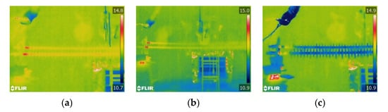 Infrared thermal images of different insulators under 0 m/s wind (RH = 50%). (a) sheath-aging; (b) decay-like; and (c) contaminated.