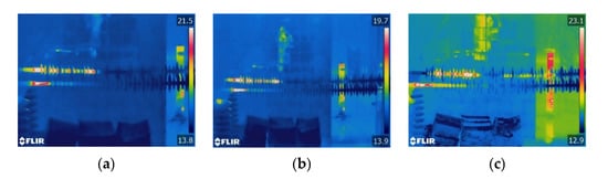 Infrared thermal images of decay-like insulators under different levels of humidity. (a) RH = 50%; (b) RH = 70%; and (c) RH = 90%.