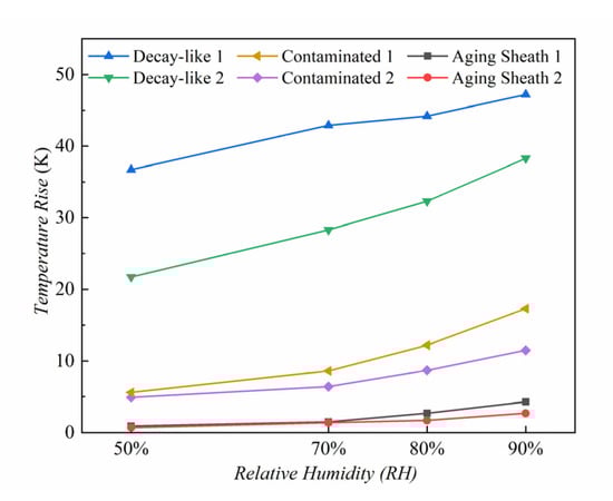 Figure 8 depicts the temperature rise in the composite insulators with abnormal heating under various humidity levels.