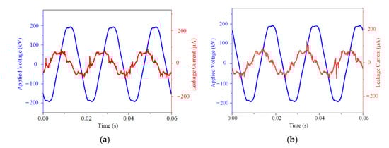 Figure 10 displays an experimental voltage and leakage current at a relative humidity of 70%. The fundamental component of the leakage current is extracted, and the phase difference between the fundamental component of the leakage current and the test voltage is calculated to reflect the phase characteristics of the leakage current. The fundamental effective value of leakage current and the phase difference are shown in Table 2. Due to the influence of stray corona and environmental noise, the LC waveform exhibits burrs.