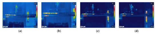 Infrared thermal images of contaminated insulators under different levels of humidity. (a) RH = 50%; (b) RH = 70%; (c) RH = 90%; and (d) RH = 100%.
