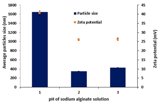 Effects of changing pH of sodium alginate solution on the average particle sizes and zeta potential of Ch1.5:Ag1 MPs prepared using the ionic pre-gelation method, CaCl2 (0.22% w/v), volume ratio (1:1) v/v, Ch (Ph = 5.5). Results are expressed as means ± SD, n = 3.