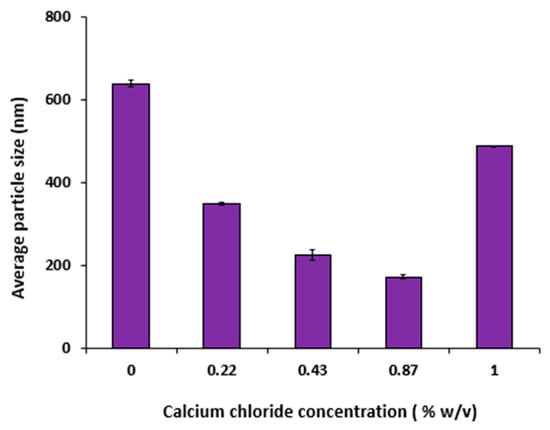 Effects of different concentrations of calcium chloride on the average particles’ sizes of Ch1.5:Ag1 formulation prepared using the ionic pregelation method. Results expressed as mean values ± SD, (n = 3).