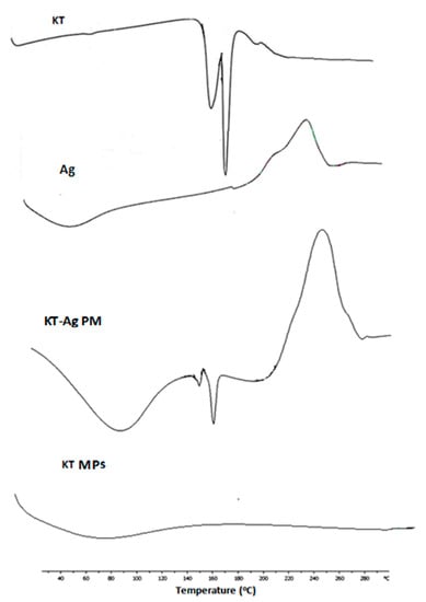 The DSC thermograms of drug, Ag, PM and drug loaded (Ch1:Ag0.5:KT10) MPs are shown in Figure 6. The thermogram recorded for Ag exhibited a broad peak (60 to 110 °C); this could be ascribed to the loss of the surface-bound moisture from this amorphous polymer. Also, the exothermic peak for Ag was at 245 °C due to decomposition of the polymer. The endothermic peaks of PM of drug with Ag demonstrated the characteristic features of polymers and drug alone indicating that there were no interactions between the polymers and KT. Thermograms for Ch-Ag loaded MPs showed no endothermic peak for the drug. The DSC thermogram of MPs showed complete disappearance of KT; this could be ascribed to complete amorphization of the drug within the MPs.
