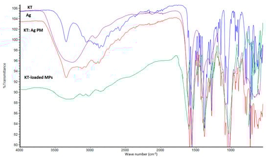 Figure 7 displays the FTIR spectra of KT, Ag, and loaded Ch-Ag based MPs formulations. In the spectrum of KT, characteristic peaks (3340 cm−1 ascribed for NH stretch; 1144 cm−1 ascribed for carbonyl group (C=O) stretch; and 1556 due to aromatic stretching. There was no discernible detection in the drug’s IR spectra when KT was trapped in Ch-MPs. This peak in MPs was displaced at 3349 cm−1, which is an indicator that the KT reaction with Ag was noticeable. KT exhibited a high absorption peak at 3343 cm−1 that could be ascribed to NH stretch. Furthermore, KT had two additional strong peaks at 1560 cm−1 and 1146 cm−1, which were also obtained in loaded MPs at the exact same location. The amide or the hydroxyl groups of CS cannot form strong connections with the amino group of KT, according to these data. In order to prevent any drug-polymer interactions from occurring during the creation of MPs, FTIR investigations were conducted [36].