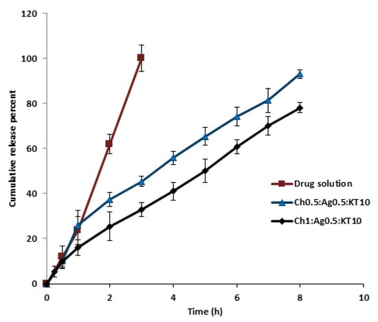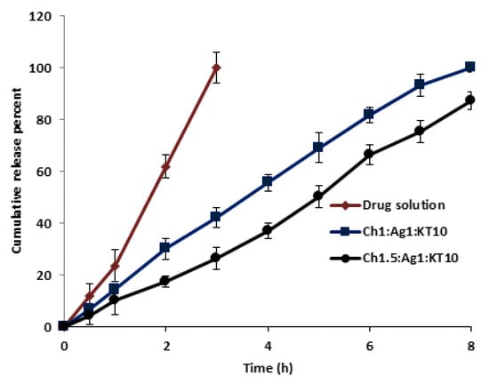 The cumulative release of KT from Ch-Ag MPs in PBS at 35 °C is shown in Figure 8. After optimizing the conditions, only two different ratios from all prepared KT loaded Ch-Ag MPs were selected for the in-vitro release study depending on size, zeta potential, EE% and different formulation parameters observed during the formulation process. Figure 9 shows the sustained release profile of KT from the Ch-Ag MPs up to 8 h. Furthermore, the MPs redispersed in PBS (pH 7.4) after centrifugation containing an amount of drug equivalent to 5 mg/mL, showed a significant (p < 0.05) controlled drug release pattern compared with the control KT solution. KT released completely from the drug solution after 3 h, while that from the selected MPs was approximately 92% and 78% after 8 h from (Ch1:Ag0.5:KT10) and (Ch0.5:Ag0.5:KT10), respectively. The presented data indicated that the pattern of release of KT from loaded MPs was nearly the same. However, increasing Ch concentrations led to decreases in drug release rates. This could be due to the fact that high concentrations of Ch cause the media to be more viscous and thus hinder the release of KT; this could explain nearly 14% more decreases in the release pattern of KT compared with a smaller ratio for the same period of time [26]. The results were in agreement with those reported for KT release from polymeric micelles, with 60% of the drug released after a period of 8 h [36,37].