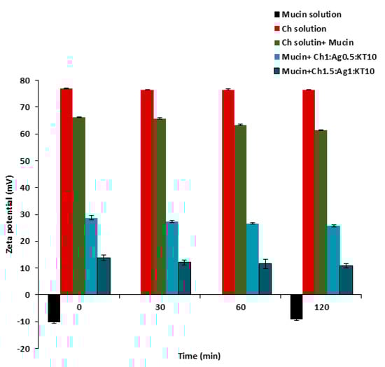Comparing the zeta potential of the mucin colloidal system before and after incubation, the results showed slight decreases in the zeta potential for (mucin and Ch solution) and (mucin and Ch-Ag MPs). Figure 10 shows the zeta potential values of 66 mV and 61.5 mV for the combination of Ch solution and mucin before and after incubation, respectively.The results obtained with Ch1: Ag0.05:KT10 MPs were 28.7 ± 0.54 mV and 25.7 ± 0.34 mV before and after incubation, respectively. However, for Ch1.5:Ag1:KT10 MPs prepared using the pre-gelation method the decrease in the zeta potential was significant (p < 0.05) where zeta at zero time was 13.8 ± 0.78 mV and after 2 h became 10.87 ± 0.798 mV, Figure 10. This insignificant (p < 0.05) reduction could be related to electrostatic interactions of the negatively charged sialic groups of mucin with the positively charged amino groups of Ch. These findings indicated that the prepared Ch0.5:Ag0.05:KT10 formulation could interact with mucin with no alteration in corneal viscosity [22].