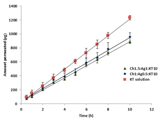 The same tested MPs formulations used in the previous experiment were used here in this study for the same reasons mentioned before. Figure 11 shows the corneal permeation of the drug from Ch-Ag based MPs. The permeation parameters were calculated: flux, Papp and lag time (tL), Table 12. It is clear from Figure 11 that the amount of KT permeated through the cornea from KT solution is higher than that from loaded MPs. The permeation parameters for this formulation (Ch01:Ag0.5:KT10) including steady-state flux, apparent permeability coefficient (Papp) were 91.42 ± 2.1 (µg/h) and 2.97 ± 0.71 (cm/sec), respectively, which is obviously lower compared with the same data for KT solution, Table 12.