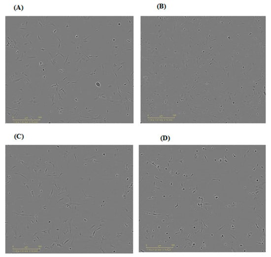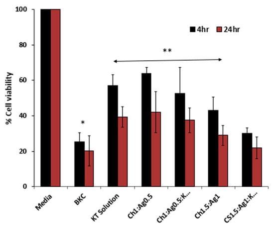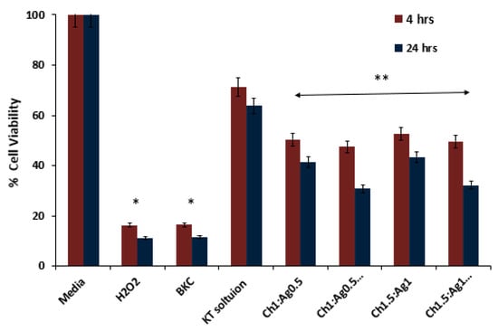 Figure 13 indicates the percent control measured for cells after 4 h of treatment with MTT. It could be seen that the cytotoxicity of Ch: Ag MPs for both formulations tested was insignificant. Upon comparing the percent cell viability of Ch1:Ag0.5:KT10 with the drug solution, there was a significant difference (p < 0.05) between them. This could indicate that Ch polymer is a potential ingredient in MP preparation as it may be responsible for samples’ cytotoxicity. However, there was an insignificant difference between the formulations, both plain and medicated.