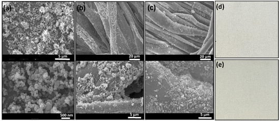 SEM images of (a) Zn@TiO2-0.5 NPs, (b) C-Zn@TiO2(4), and (c) C-Zn@TiO2(4) after 10 washes, (d) pristine cotton fabric, and (e) functionalized Zn@TiO2 coated cotton fabric.