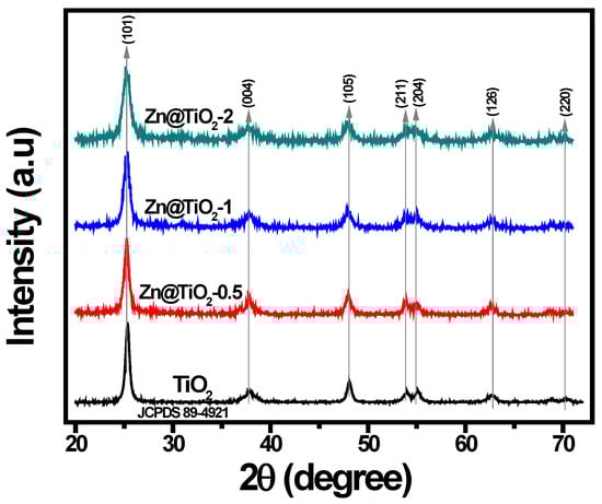 The X-ray diffraction patterns of pristine TiO2 and Zn-doped TiO2 (0.5 mol%, 1 mol%, and 2 mol%) NPs are presented in Figure 3. The strong and sharp diffraction peak represents the high crystallinity of fabricated NPs. The pattern of pristine TiO2 showed anatase phase as diffraction peaks at 2ϴ = 25.2°, 37.9°, 48.0°, 53.8°, 55.0°, 62.8°, and 70.1° were observed, which correspond to the crystal planes of (101), (004), (105), (211), (204), (126), and (220) (JCPDS 89-4921). No additional peaks in Zn-doped TiO2 NPs were observed, indicating no effective change in the structure of tetragonal TiO2 after Zn doping. This could be due to the similarity in ionic sizes of Ti4+ and Zn2+. However, a small reduction in the anatase phase peak intensities was observed after Zn doping, owing to the formation of ZnTiO3 species at higher Zn loading. Therefore, increasing the Zn doping promotes the formation of ZnTiO3, which results in anatase to rutile phase transformation. The crystallite size of NPs was calculated to be 10.4 nm, 8.8 nm, 6.8 nm, and 5.6 nm for TiO2, Zn@TiO2-0.5, Zn@TiO2-1, and Zn@TiO2-2, respectively, using the Scherrer formula.