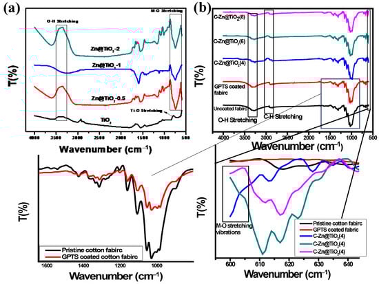 FTIR analysis of (a) pristine TiO2 and Zn@TiO2 NPs, and (b) uncoated, GPTS coated, and Zn@TiO2 NPs coated fabrics.