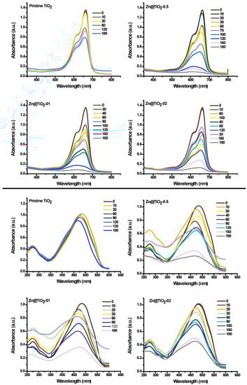 The photocatalytic degradation process of organic pollutants using doped NPs depends on multiple factors, such as solution pH, reaction time, amount of photocatalyst, and amount of doping level. Therefore, the multifactor-dependent process should be optimized in all respects, to achieve the best performance of doped NPs. Analyzing the optimum concentration of dopant in a photocatalyst is of considerable importance. Doping generates a sub-level (heterostructure) in a pristine photocatalyst (i.e., TiO2 in this study). The heterostructure provides a trapping site for key radicals, and prevents the recombination of electron-hole pairs to boost photocatalytic activity. Besides prevention in recombination, the addition of a dopant also reduces the energy band gap for the photoexcitation of electrons. However, when the concentration of the dopant exceeds a certain limit, the Zn acts as a recombination center for charge carriers, and lowers the efficiency of the degradation process []. Therefore, the reduction in degradation efficiency of photocatalysts at higher Zn doping was observed (Figure 5). Figure 5 showed the UV-visible spectroscopic analysis of MB and MO dyes at various time intervals. The Zn@TiO2 with the Zn doping of 0.5 mol percent was the most efficient photocatalyst towards effective dye degradation (for both cationic and anionic dyes). Therefore, Zn@TiO2-0.5 was chosen for further study.