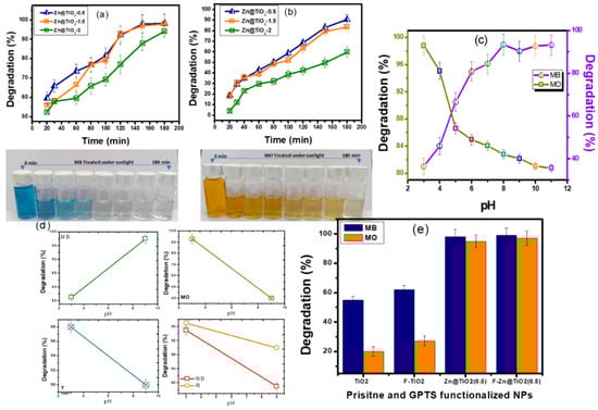 Effect of different doping levels of Zn on % degradation of (a) MB and (b) MO. Response of Zn@TiO2-0.5 (dose = 50 mg/100 mL) (c) under different conditions of solution pH using MO and MB, and (d) under acidic and basic pH using Y, R, and NB dyes (all dyes concentration = 10 ppm); (e) effect of GPTS functionalization on the photocatalytic response of NPs.