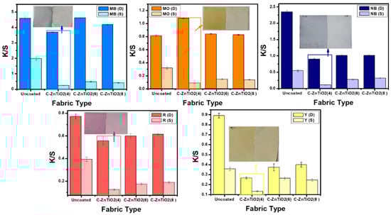 The results of the K/S analyses are presented in Figure 7. The results showed that the 4 wt% loaded NPs (o.w.f.) exhibited a far better reduction in K/S values as compared to other fabrics. The inset of every bar graph is the real image of fabric (C-Zn@TiO2(4) placed in the dark (D) and exposed to sunlight (S) placed for every dye. The results present the far superior photo-catalytically assisted self-cleaning activity of dyed fabrics under sunlight. Interestingly, the extensively used and resistive toward effective degradation textile dyes, i.e., drimaren blue, yellow, and red, also showed excellent degradation under sunlight, ensuring that the functionalized fabrics with Zn@TiO2 NPs are excellent candidates for self-cleaning activity under sunlight.
