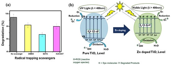 Figure 8a represents the results of radical trapping scavengers using Zn@TiO2-0.5 against MB dyes. Results showed that when no scavenger was added, MB dye degradation was 93%. However, when EDTA was added, dye degradation efficiency decreased from 93% to 67%. EDTA is a ions scavenger.