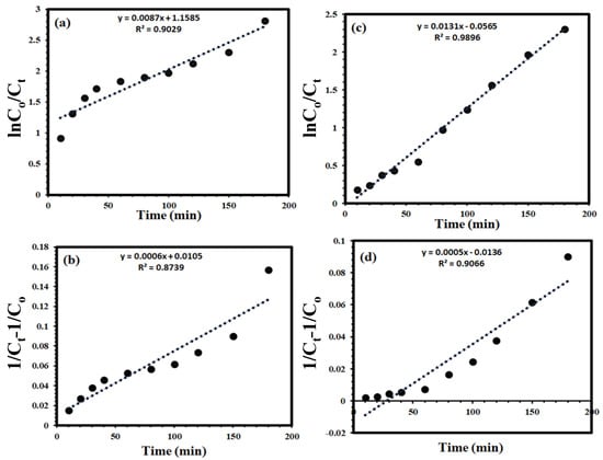 Kinetic study: (a,c) first order, and (b,d) second order reaction kinetic models, using MB (a,b) and MO (c,d) dyes.