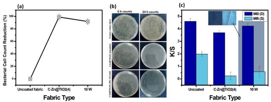 The 10 W functionalized fabric was subjected to photocatalytic activity against MB dye, under the reaction conditions described previously (Section 2.4) to check the washing stability of the functionalized fabric. Afterward, the K/S values were obtained, and no considerable increment in color strength was observed by the 10 W fabric (Figure 11c). This suggests the fabric exhibit effective self-cleaning photocatalytic activity after several rounds of washing.