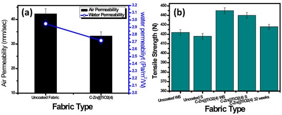 (a) Air permeability and water permeability analysis. (b) Tensile strength analysis of uncoated and functionalized fabrics.