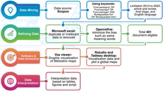 Data for this study were extracted from Scopus (scopus.com), which is a renowned research database. To minimize bias and maintain consistency amidst database changes, data collection was conducted on a single day, 21 December 2022. The string search methodology uses quotation marks, and Boolean operators (“AND” and “OR”) are used. The search keywords used are TITLE-ABS-KEY “Food packaging” OR “Food packages” OR “Food packages” AND “Biodegradable films” OR “Biodegradable film”. The selected documents met the following criteria: published between 2013 and 2022, written in English, article and review document type, and in the final publication stage. Any documents failing to meet these criteria were excluded. Data were downloaded in CSV format and organized in Microsoft Excel for easy data management, with duplicate data removed. Then, the data are inputted into Openrefine. The Openrefine version 3.6.1 application (https://openrefine.org (accessed on 22 December 2022)) was used to combine words that have the same meaning: for example, “food package and food packaging” and “antioxidant activity and antioxidant activities”. In addition, singular and plural forms of the same word, e.g., active films and active film and biopolymer and biopolymers, were also combined. Ultimately, a total of 401 documents were used for bibliometric analysis. Figure 1 provides an overview of the bibliometric analysis process through a flowchart.