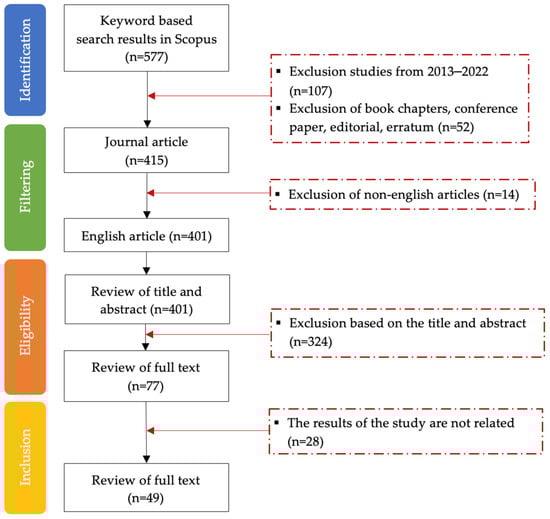 - Inclusion criteria: Study period between 2013 and 2022; studies in the final publication phase; publications in the English language; document types: article and review
