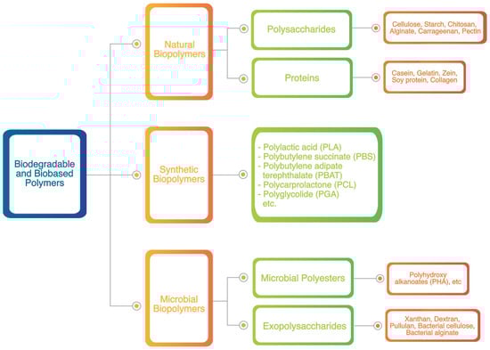 Recently, replacing non-degradable plastic packaging with biodegradable packaging materials has become more common. In the environment, biodegradable polymers can be broken down under the right environmental conditions such as humidity, temperature, oxygen availability, and presence of living creatures. This process leaves no harmful substances behind and does not negatively affect the environment. Biopolymer-based packaging materials are being investigated as an alternative to conventional plastics because of their biocompatibility, safety, and rate of biodegradation [34]. Biodegradable and biobased polymers based on their source materials are classified in three forms, including natural, synthetic, and microbial biopolymers, which are presented in detail in Figure 3. In the manufacturing of biobased polymers, the materials such as starch, organic acids, and synthetic carbonyl are added to make them biodegradable in the environment [35].