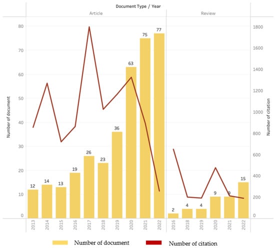 Based on the results of the bibliometric analysis, studies on biodegradable film-based food packaging films show a trend that tends to increase annually. The development of this study can be seen from two types of documents, i.e., articles and reviews, based on the number of documents published and number of citations annually (Figure 4). From 2013 to 2022, the number of documents published in this study was 401, providing details of 358 articles (89.28% of the total documents) and 43 reviews (10.72% of the total documents) with a growth rate of 25.4% annually. In 2019, studies on this theme and discussed by researchers peaked in 2022 with 77 articles and 15 reviews. In addition, the highest annual numbers of document citations for articles and reviews were in 2017 and 2016: 1799 and 650, respectively. Numerous documents and citations are based on the increasing public awareness of environmental issues and better sustainability by reducing the use of conventional (nonbiodegradable) packaging, and this suggests that the use of environmentally friendly food packaging is gaining traction these days and will continue to increase. This is consistent with the findings of Sani et al. [14] and Nygaar et al. [35], who revealed that the interest in developing biodegradable packaging films to replace non-biodegradable plastic packaging materials has recently attracted growing attention.