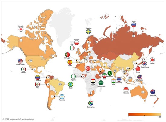 Representative map of scientific publications on the study of biodegradable films for food packaging production per country between 2013 and 2022.
