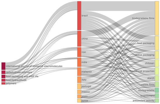 Figure 6 presents the relationship between the journals that published the most documents, most productive countries, and keywords frequently used in the study of biodegradable films for food packaging. As shown in Figure 6, documents published in the International Journal of Biological Macromolecules are mostly written by Brazilian researchers and focus on several keywords regarding biodegradable films and food packaging. According to Matheus et al. [49], Brazil has led research on the development of starch-based films. Moreover, Brazilian researchers have successfully produced CS-based biodegradable films [50,51,52,53] from gelatin [54] and starch [55,56,57,58].