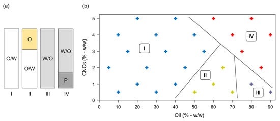 Pickering emulsions (PEs) formulated with cellulose nanocrystals (CNCs) and caprylic/capric triglycerides. (a) Classification of PEs obtained just after emulsification. O/W: oil-in-water emulsion; O: oil; W/O: water-in-oil emulsion; P: CNCs precipitate. (b) Phase diagram of the 27 freshly prepared PEs classified according to types I to IV. Blue, green, grey and red crosses represent PEs belonging to categories I, II, III and IV, respectively.
