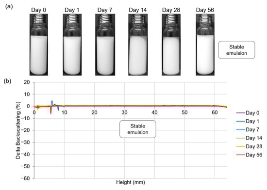 PEs stability was studied for up to 56 days of storage by observing visual aspect, measuring oil release, droplet size, and creaming phenomenon. Two examples of O/W PEs are given in Figure 2 and Figure 3. The first one corresponds to a homogeneous emulsion stored for up to 56 days that contained 4% (w/w) CNCs and 50% (w/w) oil (Figure 2a). As expected, multiple light scattering measurements indicated no variation of backscattering data as a function of time (Figure 2b), showing that no destabilization phenomena, such as creaming or coalescence, occurred in this PE.