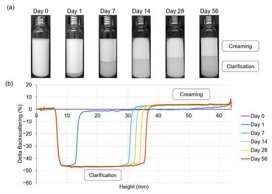 Stability evolution of a Pickering emulsion composed of 2% (w/w) CNCs and 25% (w/w) oil. (a) Visual appearance of emulsion from 0 to 56 days of storage at 20 °C. (b) Multiple light scattering analysis showing backscattering data as a function of sample height (6 to 64 mm) and of storage time (0 to 56 days).