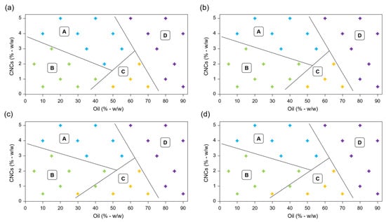 Phase diagrams of Pickering emulsions after (a) 7 days, (b) 14 days, (c) 28 days, and (d) 56 days of storage. Area defined as A, B, C, and D correspond to PEs classification as illustrated in Figure 4. Blue, green, yellow and purple crosses represent PEs belonging to categories A, B, C and D, respectively.