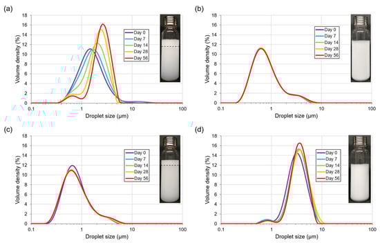 Evolution of droplet size distribution during storage (0 to 56 days) of Pickering O/W emulsions formulated with (a) 0.5% (w/w) CNCs and 10% (w/w) oil; (b) 4% (w/w) CNCs and 10% (w/w) oil; (c) 2% (w/w) CNCs and 5% (w/w) oil; (d) 4% (w/w) CNCs and 45% (w/w) oil. In inserts: photographs of emulsions after 56 days of storage with creaming indicated in dotted line for (a,c).