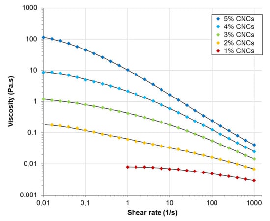 Steady-state viscosity (Pa·s) of CNCs suspensions with concentration ranging from 1 to 5% (w/w) as a function of shear rate (1/s). Black lines represent data fitted with the Carreau–Yasuda model.
