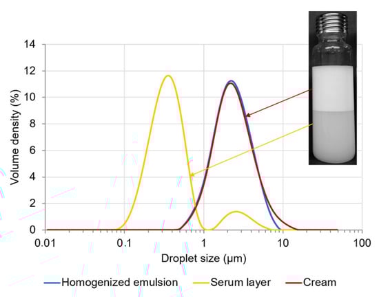 For PEs containing 2% (w/w) CNCs, and a moderate content of oil (25% (w/w)), reversible creaming was observed (Figure 8). After 56 days of storage, two main droplet populations were present with the submicronic particles in the serum layer and the larger micrometric droplets in cream, confirming that larger droplets creamed faster than smaller ones. Phase separation was reversible after homogenization, indicating that CNCs still stabilized the O/W interface. Submicrometric particles were not detected in homogenized emulsion, probably due to their small proportion compared to micrometric droplets.
