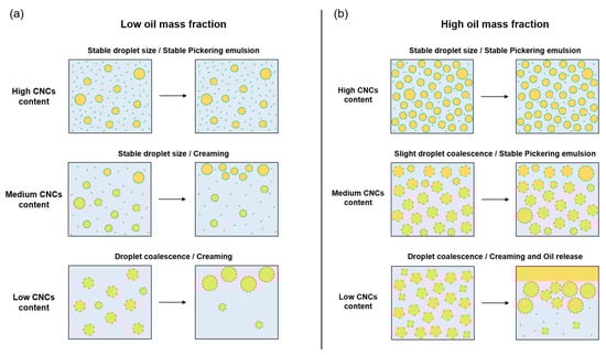 Mechanisms proposed during storage of PEs, depending on CNC content for (a) low oil mass fraction (approximately 5 to 25% w/w) and (b) high oil mass fraction (approximately 25 to 50% w/w).